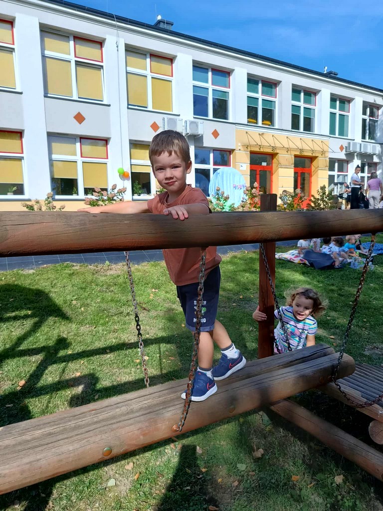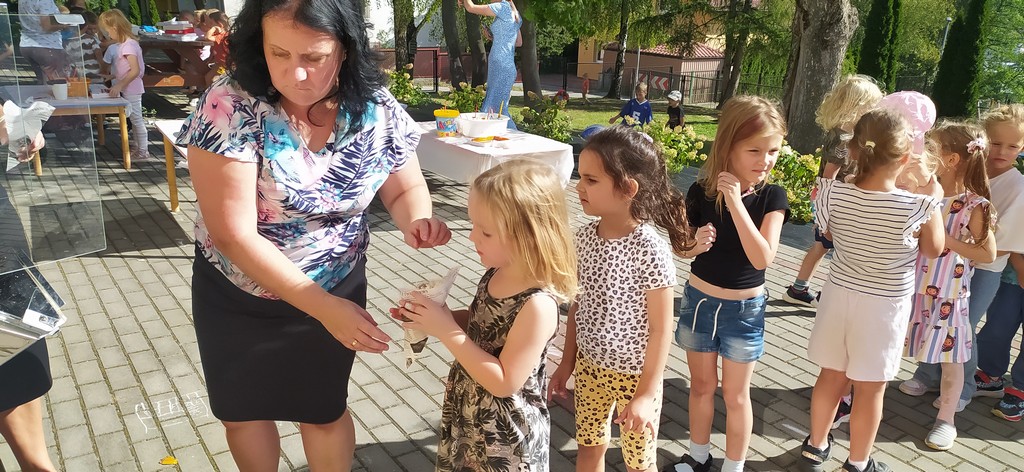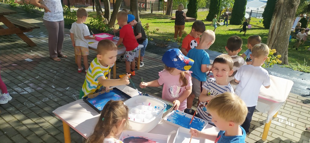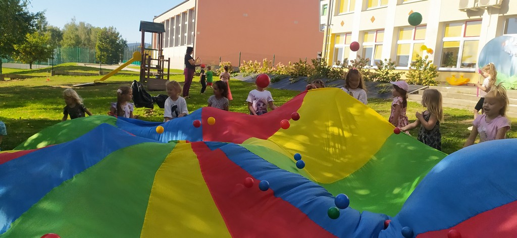 W poniedziałek 22 września w naszym przedszkolu obchodziliśmy "Dzień Przedszkolaka". Dzieci zostały zaproszone do wspólnej zabawy w ogrodzie przedszkolnym. Wzięły udział w zabawach ruchowych przeciągania liny, skokach w workach, zabawach z chustą animacyjną oraz malowały obrazki na pokrywkach z pudełek. Na dzieci czekał również pyszny poczęstunek popcorn, ciasteczko oraz soczek.