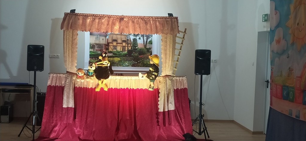 Aktorzy zaprezentowali przedstawienie pt.: „Maciuś Strażak”. Tematyka dotyczyła bezpiecznego i rozważnego obchodzenia się z ogniem, unikania niebezpieczeństw podczas zabawy w domu, na podwórku oraz odpowiedzialnego reagowania w sytuacjach trudnych. Główny bohater przedstawienia – Maciuś, poprzez angażowanie swoich zwierzęcych przyjaciół w różne działania na rzecz poprawy ładu i porządku w gospodarstwie, uczy dzieci przede wszystkim odpowiedzialności, pracy na rzecz innych oraz samodyscypliny.