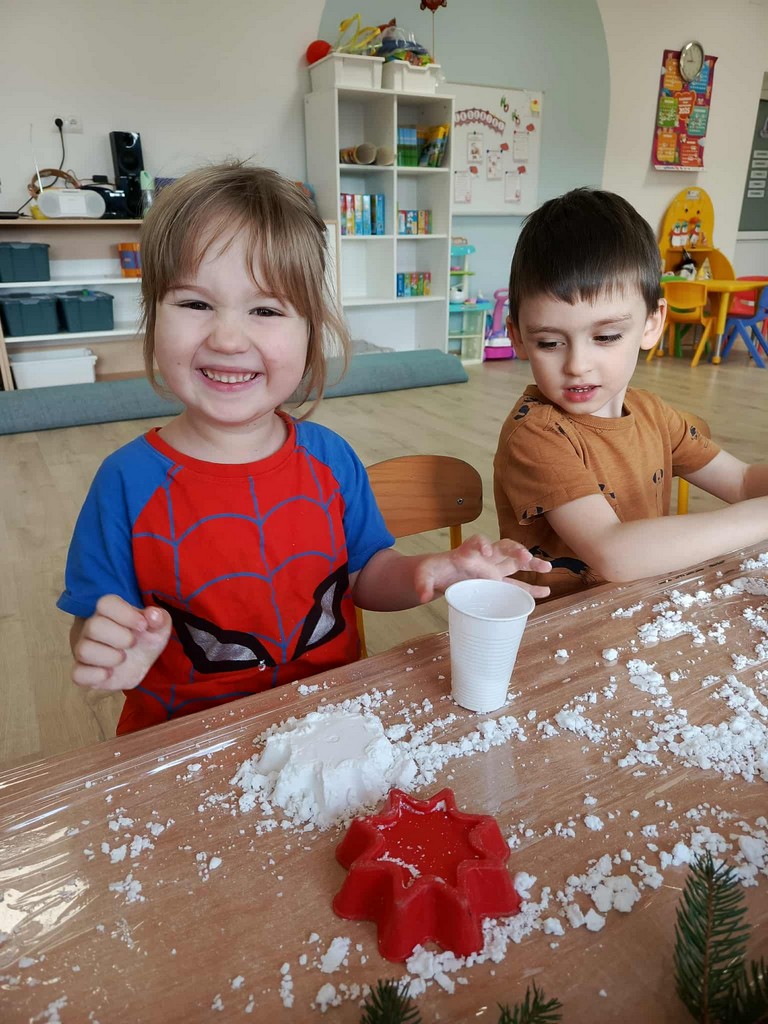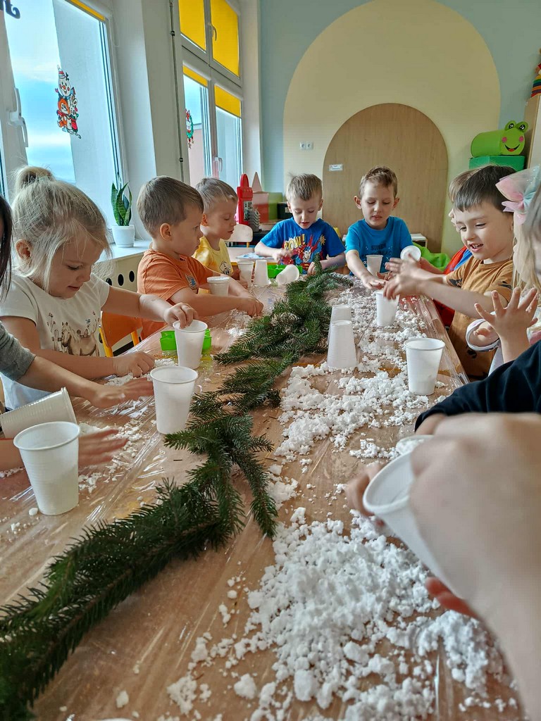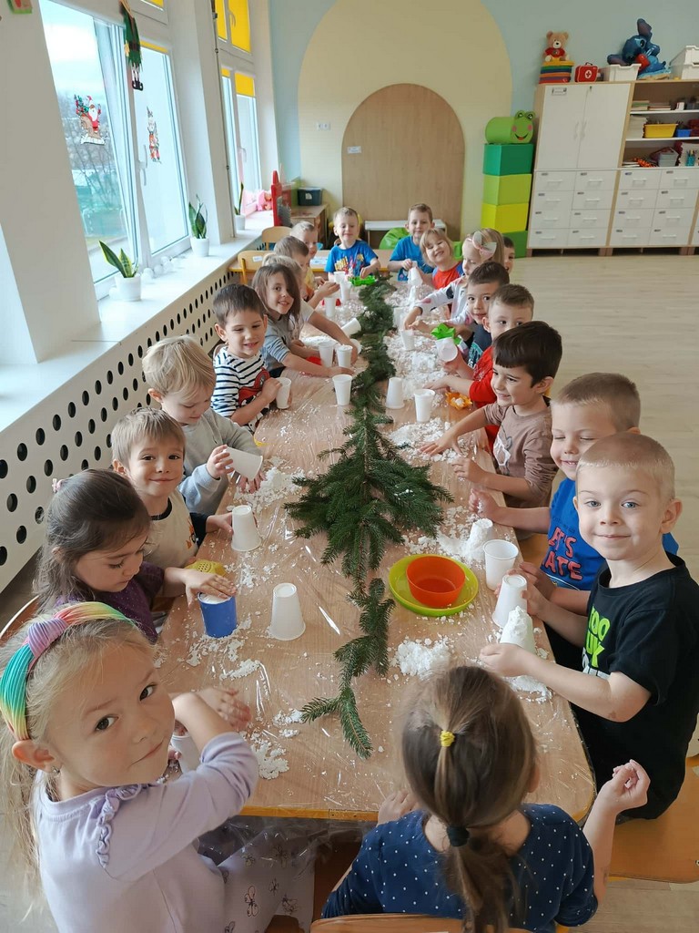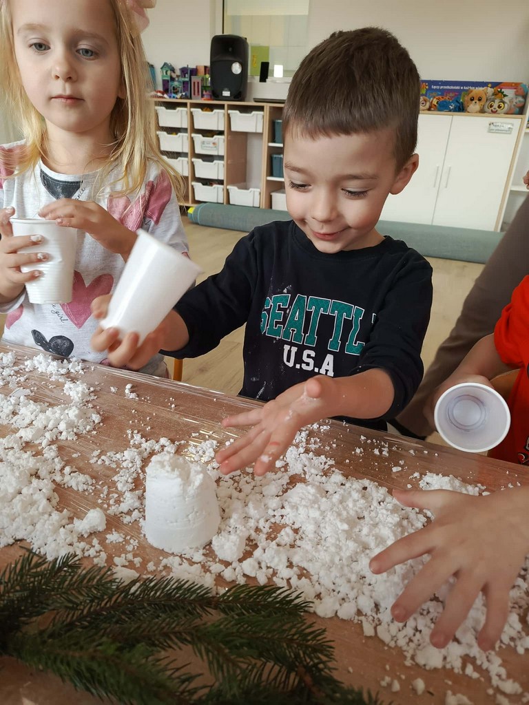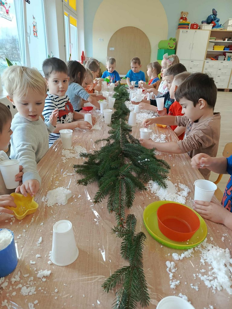 W naszym przedszkolu czas przedświąteczny jest obfity w ciekawe aktywności. Śnieg za oknami niestety stopniał, więc postanowiliśmy aby na dłużej i nas zagościł. Gdzie? W sali przedszkolnej! Zapytacie ,ale jak to? Śnieg w sali? Oczywiście! Sami zobaczcie jak średniaki lepiły mini bałwany, pociągi, gwiazdki ze sztucznego śniegu podczas zajęć sensorycznych. Cudnej zabawie towarzyszyła mikołajkowa muzyka, która dodatkowo umilała czas.