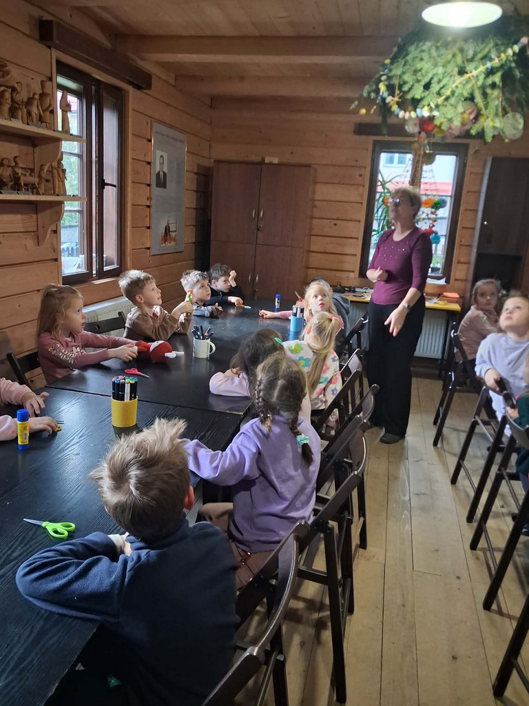 5 grudnia dzieci z grupy 2 pojechały do Szymbarku, do Skansenu Wsi Pogórzańskiej im. prof. R. Reinfussa na warsztaty ozdób bożonarodzeniowych. Spotkanie rozpoczęło się od pogadanki na temat dawnych tradycji związanych ze Świętami Bożego Narodzenia. Następnie dzieci zaczęły wykonywać ozdoby choinkowe wg słownych i poglądowych instrukcji Pań prowadzących. Zrobiły piękne, kolorowe ptaszki, zwierzątka z łupinki z orzecha oraz,, świat" ozdobę z opłatków, która sprawiła im najwięcej frajdy. Był też czas na zjedzenie pysznych przekąsek, a także na zwiedzanie zagrody. Dopisała piękna pogoda i towarzyszyły nam dobre humory. Z miłą chęcią tam jeszcze wrócimy!
