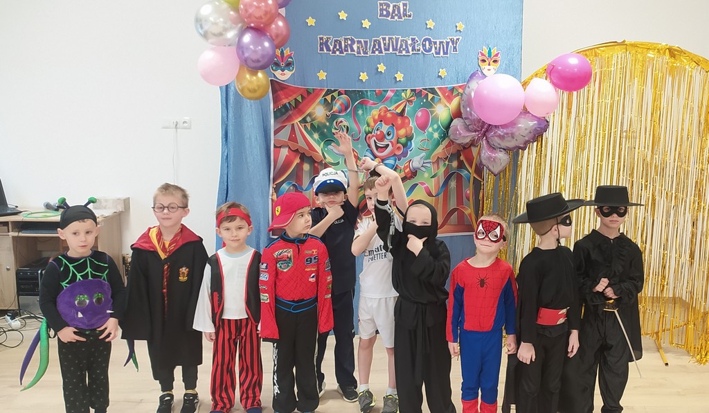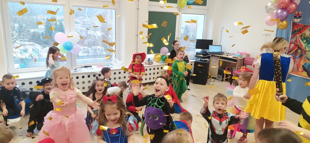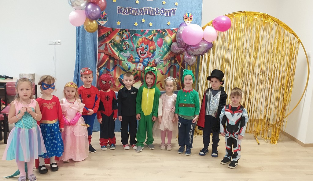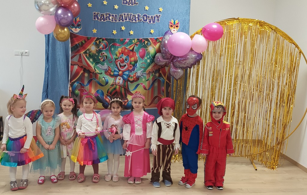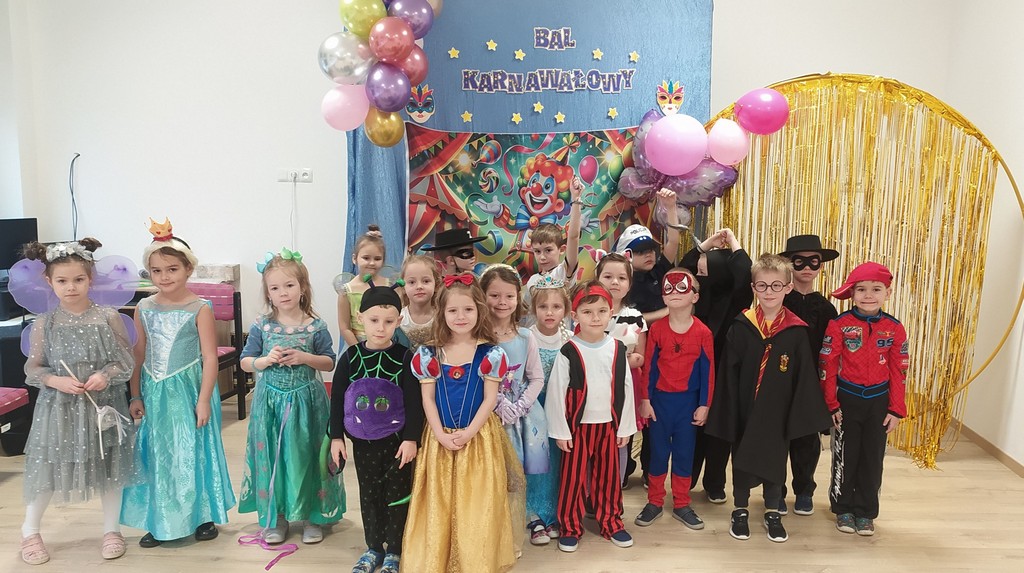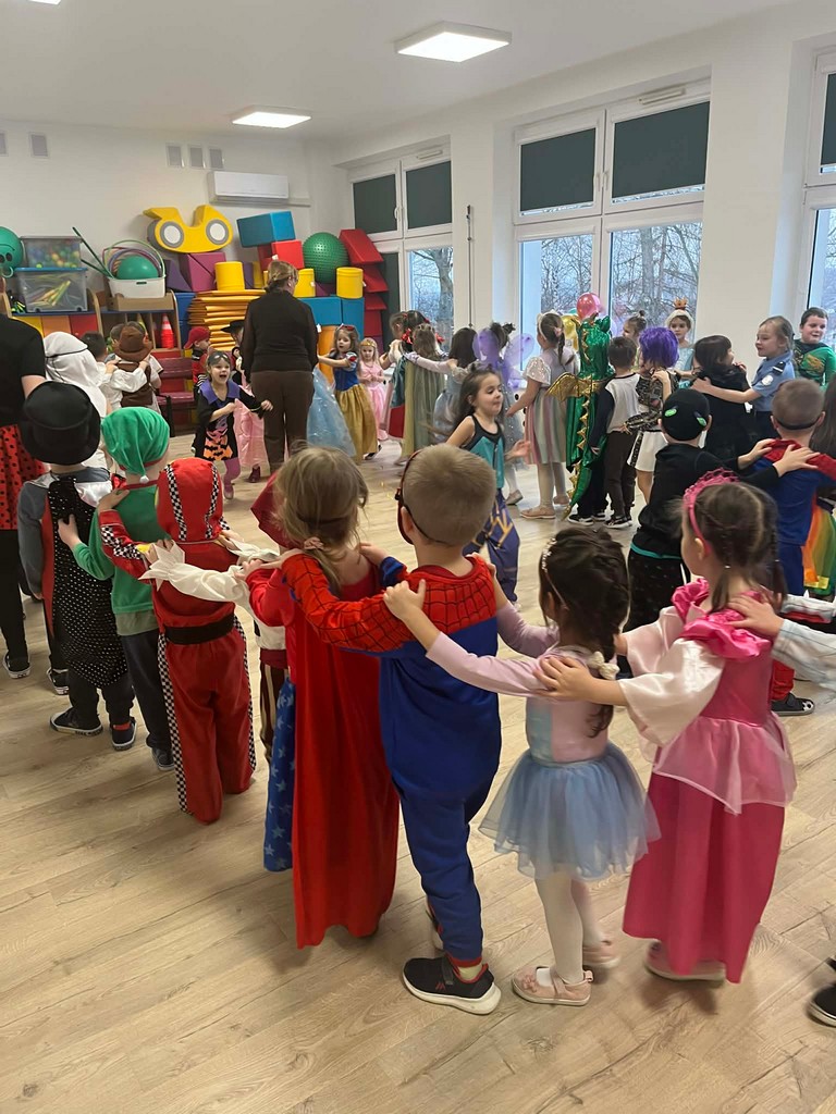 30 stycznia w naszym przedszkolu odbył się bal karnawałowy. Dzieci wcieliły się w różne postacie bajkowe. Zamieniły się w królewny, księżniczki, wróżki, biedronki, spidermanów, piratów, strażaków czy policjantów. Przebierańcy świetnie bawili się, uczestnicząc we wspólnych zabawach, a skoczna i rytmiczna muzyka zachęcała do tańca. Wszystkim zabawom towarzyszył śmiech, radość i spontaniczna aktywność dzieci, a cały bal karnawałowy przebiegał w miłej, serdecznej atmosferze i dostarczył niezapomnianych wrażeń. W trakcie karnawałowych szaleństw był czas na słodką przekąskę, jak również na pamiątkowe zdjęcia.