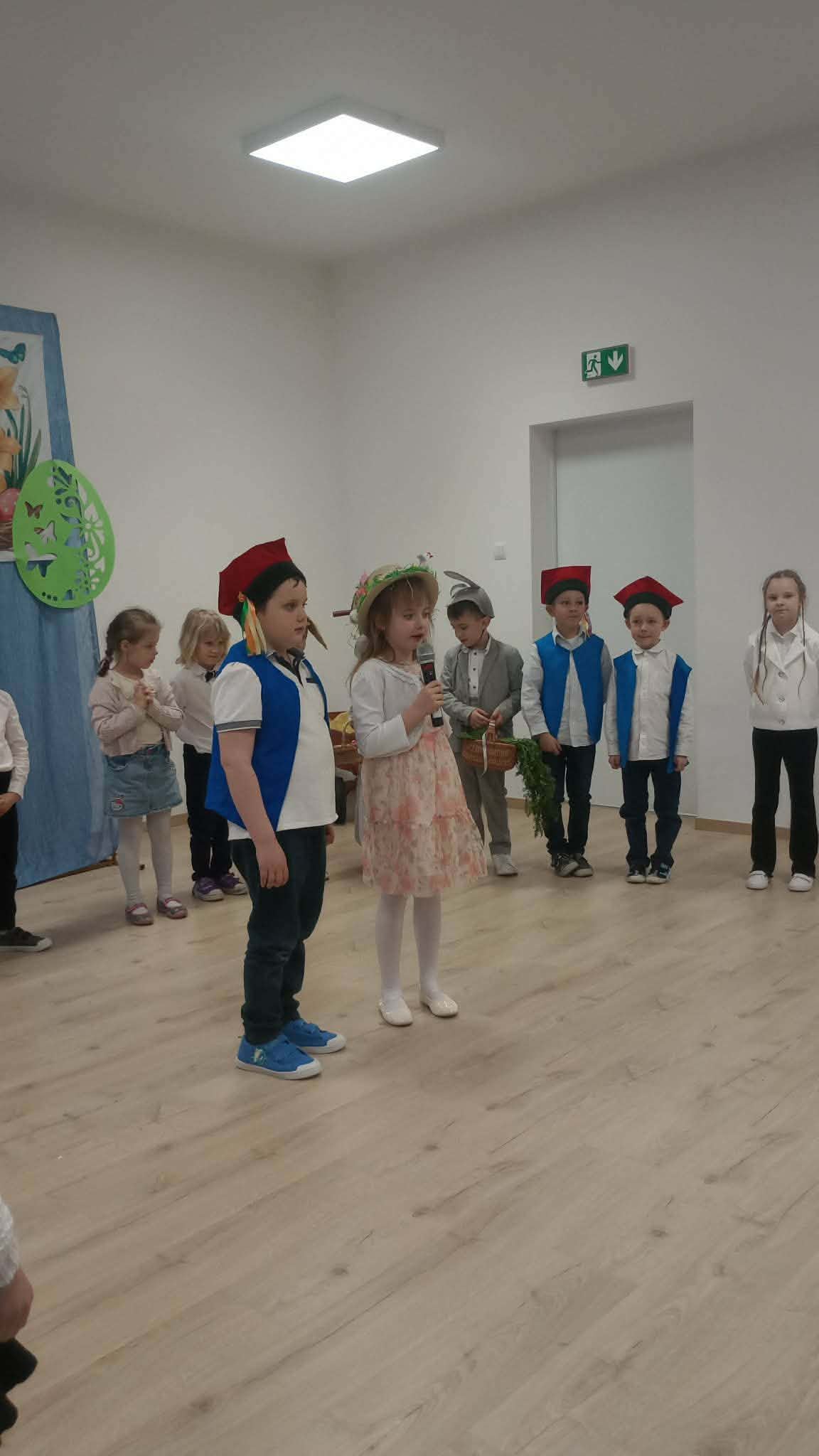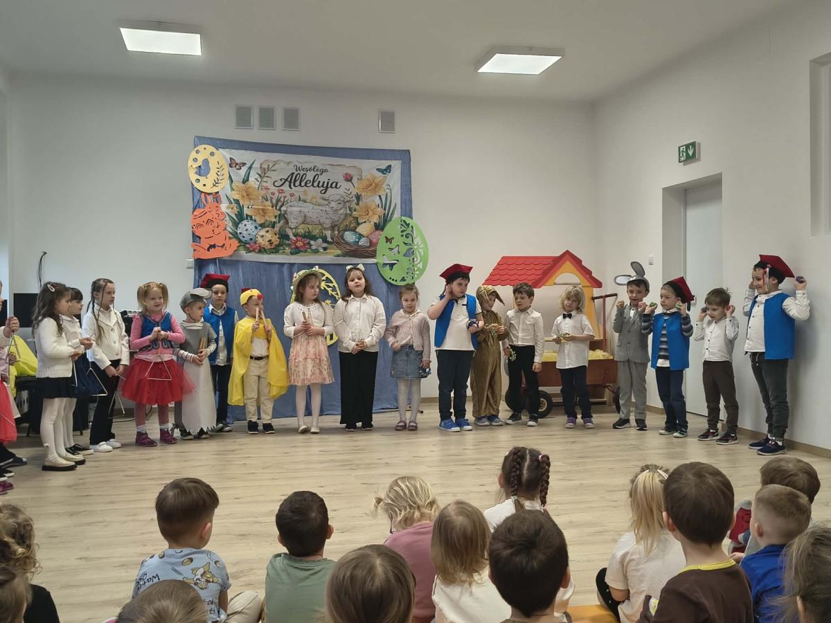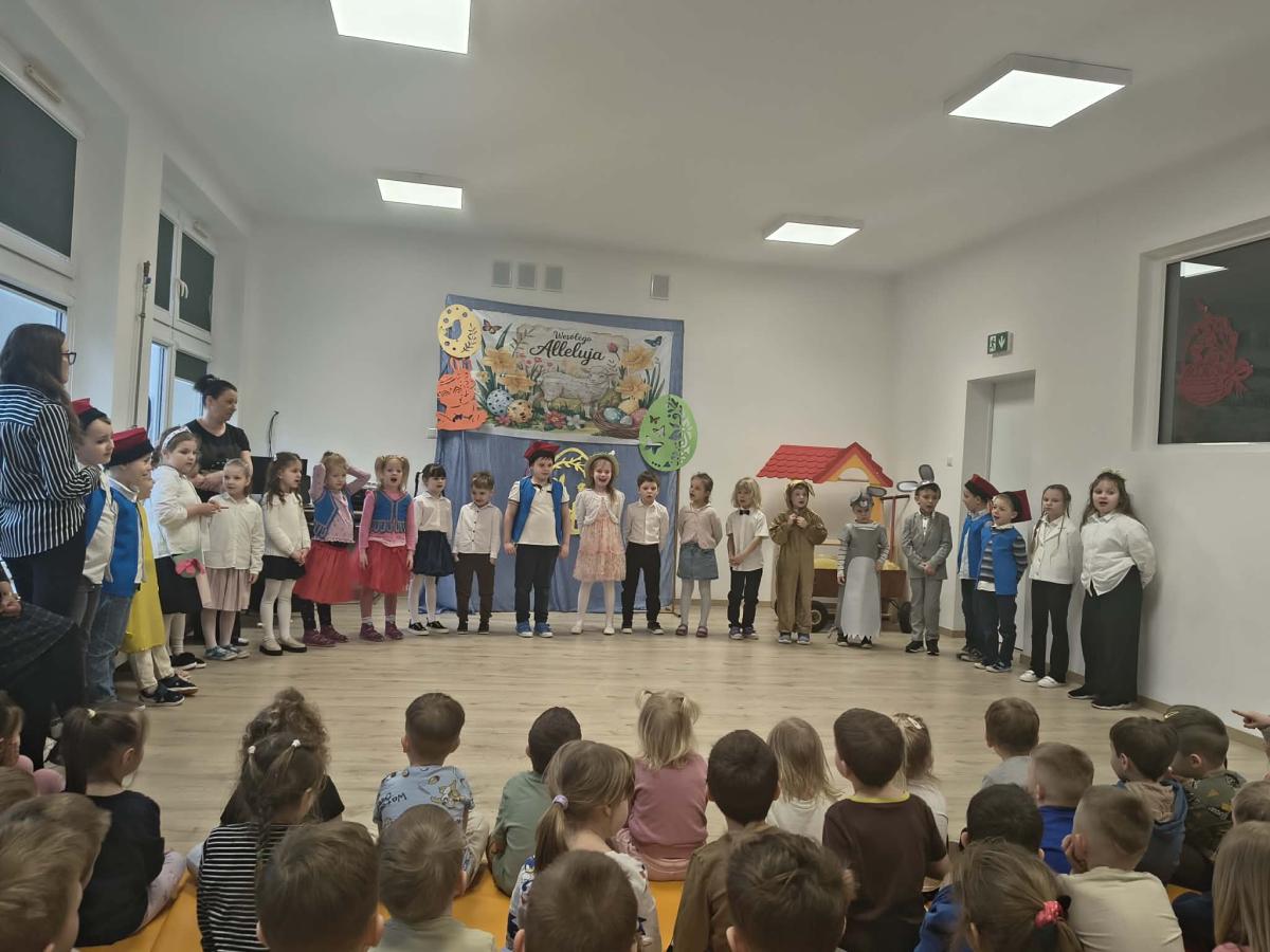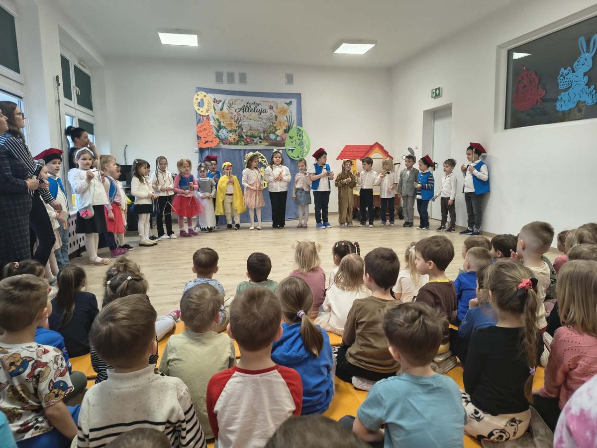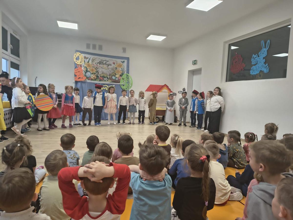 31 marca w naszym przedszkolu odbył się uroczysty występ wielkanocny przygotowany przez dzieci z grupy II. Przedszkolaki z wielkim zaangażowaniem zaprezentowały przygotowany program artystyczny, w którym nie zabrakło wierszyków, piosenek oraz elementów inscenizacji nawiązujących do tradycji Świąt Wielkanocnych. Mali artyści wystąpili w pięknych, kolorowych strojach, wcielając się m.in. w zajączki, kurczątka oraz pisanki. Występ był również okazją do przybliżenia przedszkolakom polskich tradycji wielkanocnych.